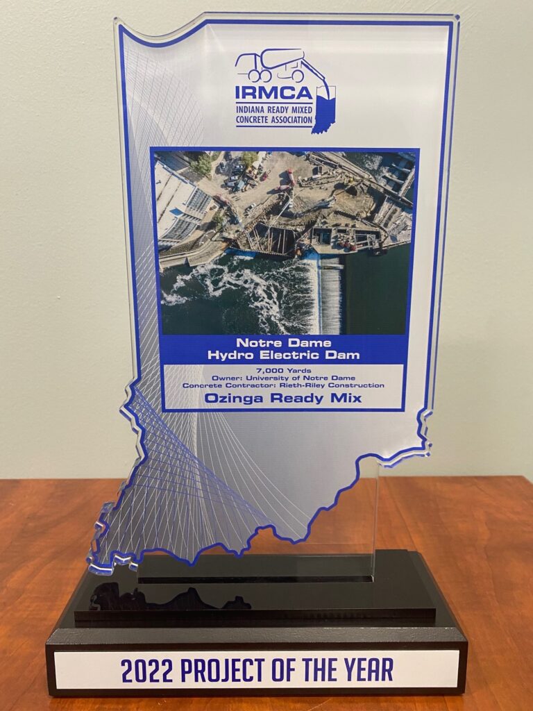 February 3, 2022 (Mokena, IL)—Ozinga took home five awards at this year’s annual Short Course Winter Meeting for the Indiana Ready Mix Concrete Association (IRMCA), including Project of the Year for the Notre Dame Hydro Electric Dam. The Hydro Electric Dam took 2 years and 7,000 yards of concrete to