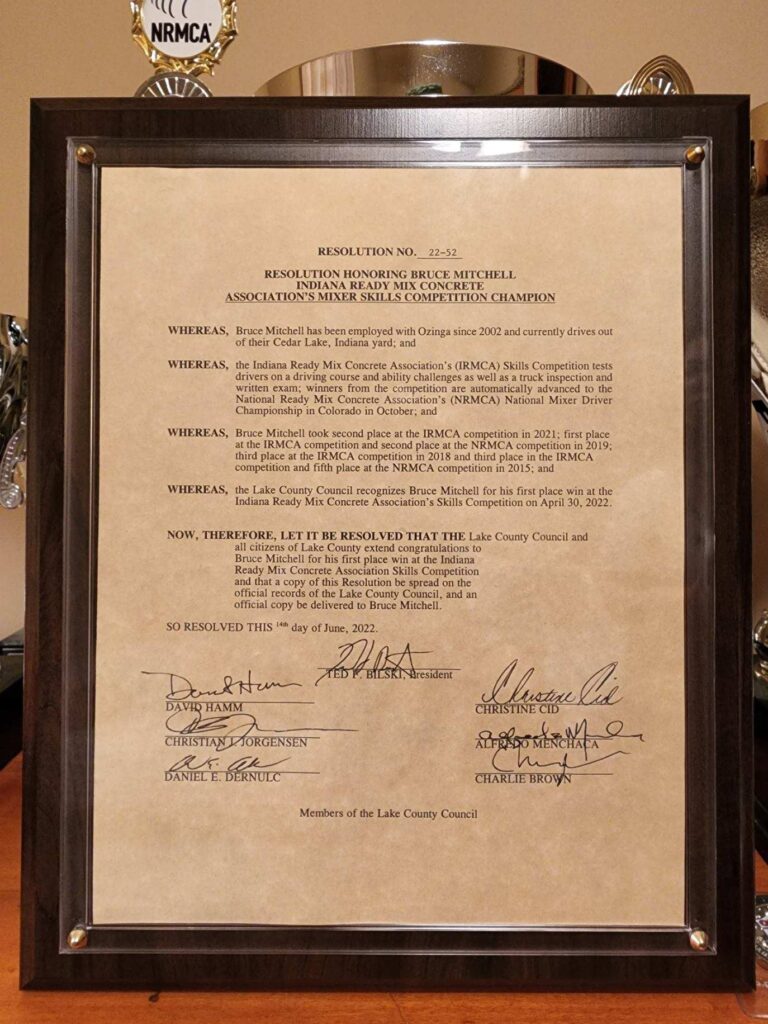 On June 14, Bruce Mitchell, ready mix driver at our Cedar Lake yard, was recognized by the Lake County Council for his many awards as a mixer driver, including his most recent first place honor at the Indiana Ready Mix Concrete Association’s Mixer Skills Competition. Bruce was awarded a framed