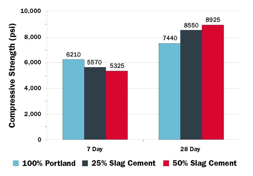 Compressive strength will vary depending on the mix design, with 100% Portland cement providing higher early strength at 7 days. However, incorporating 25% or 50% slag cement can result in greater long-term strength at 28 days, offering both performance and sustainability advantages.