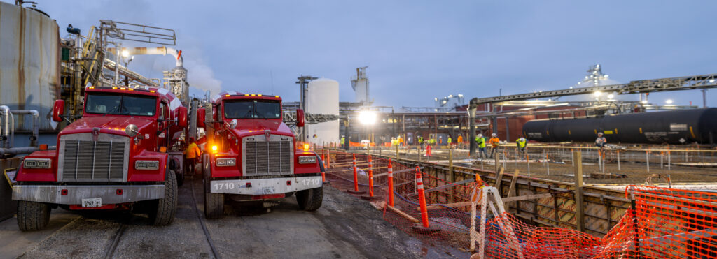 Ozinga’s team worked closely with Lindblad Construction to develop detailed logistics protocols for the challenging site conditions. Drivers received specific instructions for entering and exiting the facility, positioning at concrete conveyors, and navigating through the active industrial environment. These protocols addressed the strict safety guidelines while ensuring efficient material flow.