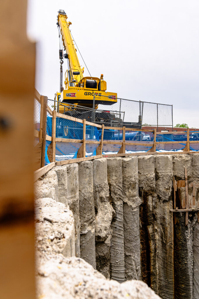 - Drilling Primary Piles – Non-reinforced concrete piles are installed in alternating spaces.